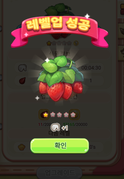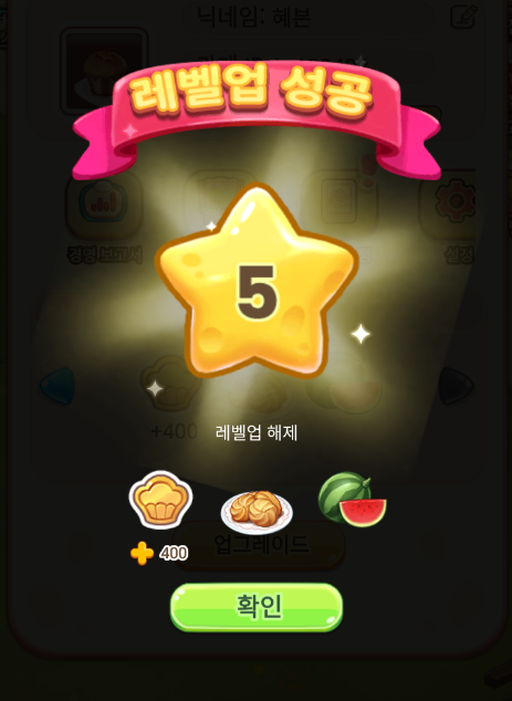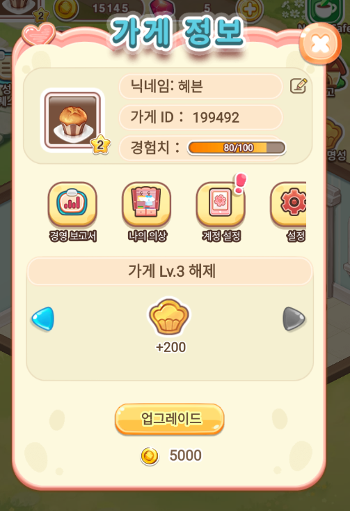 일정량의 경험치와 게임머니를 소모하여 다음 레벨로 가게를 업그레이드 하는 시스템입니다. 가게를 레벨업하면서 다양한 베이킹 레시피, 재료, 재배 가능한 작물 및 과일 등이 잠금 해제됩니다. 이후 정해진 레벨마다 4층까지 가게를 확장할수도 있습니다.