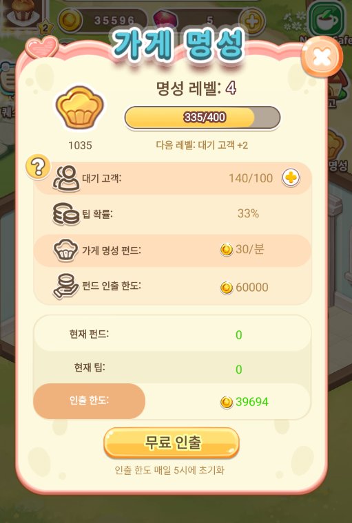 가게 장식품을 구매하고 식물 및 디저트의 별등급을 증가시키면서 명성을 획득할 수 있는데요, 이는 가게의 인지도를 나타냅니다. 명성을 업그레이드할수록 마케팅 효과가 있어서 더 많은 고객들이 찾아와 더 큰 운영수익과 함께 명성 펀드를 얻을 수 있습니다.