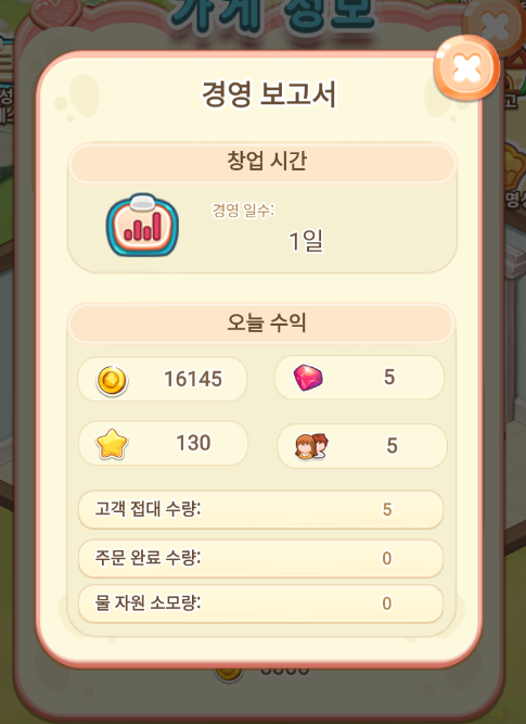 가게 정보에 들어가면 경영 보고서 및 나의 의상 메뉴를 이용할 수 있으며 현 가게 상태를 체크할 수 있답니다.