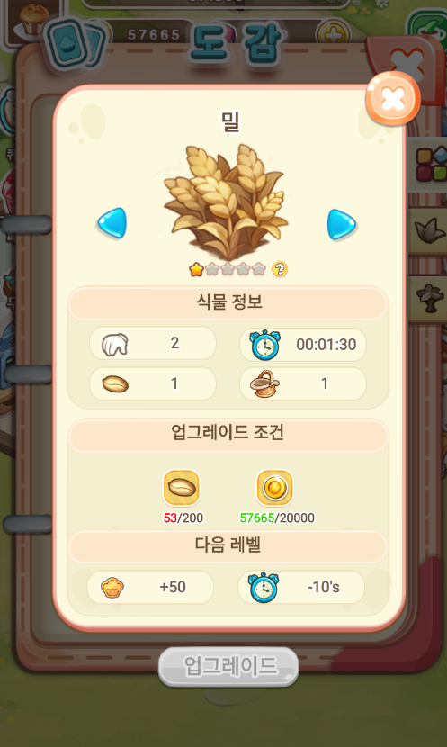 이후 레벨 6이되면 도감이 잠금해제됩니다. 도감에서 다양한 재료들을 업그레이드 할 수 있