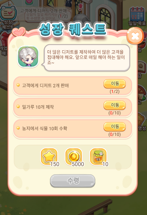 주인공이 가게를 물려받게 된 내용과 함께 게임이 시작됩니다. 한칸 공간의 디저트 카페를 운영하게 되었는데요, 부드러운 색감과 아기자기한 느낌 캐릭터와 분위기에 눈이 편안해집니다.