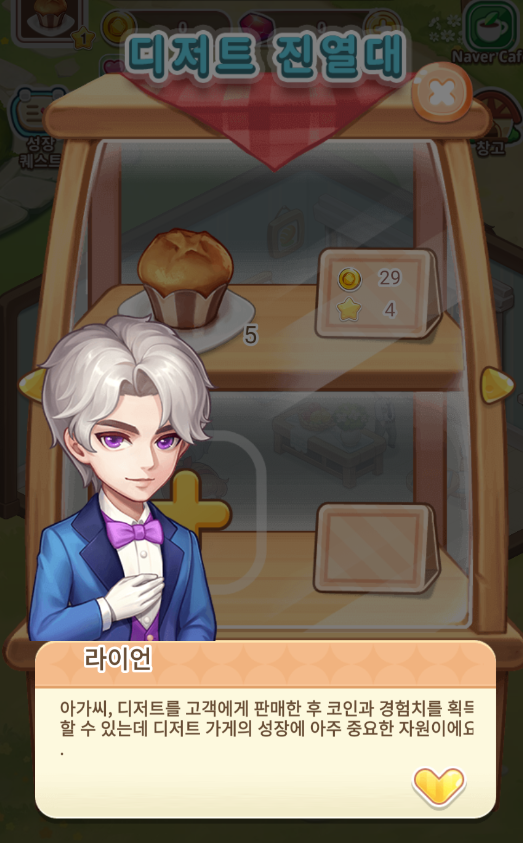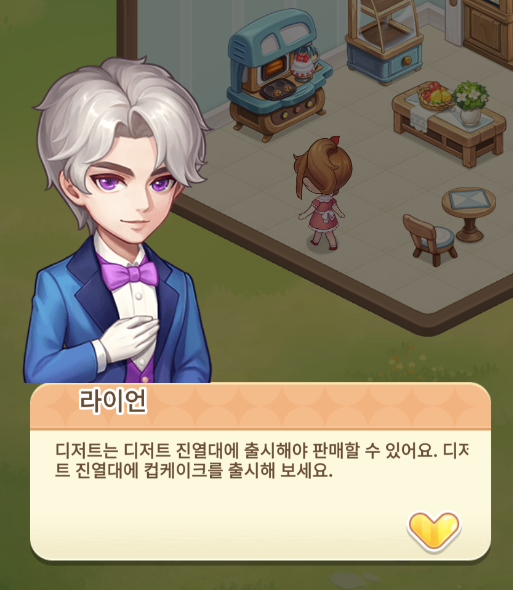 새로운 디저트는 판매를 위해 이렇게 진열대에 배치해둡니다. 색감도 좋고 그래픽도 부드러워서 게임에 더 몰입이 되더라구요.