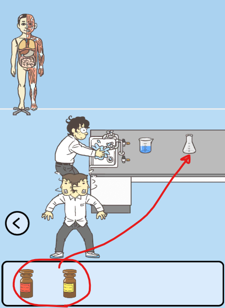 오른쪽 공간에서 두병의 용액을 얻어준 뒤에 오른쪽 맵으로 이동하여 비어있는 비커에 두가지 용액을 합쳐주세요.