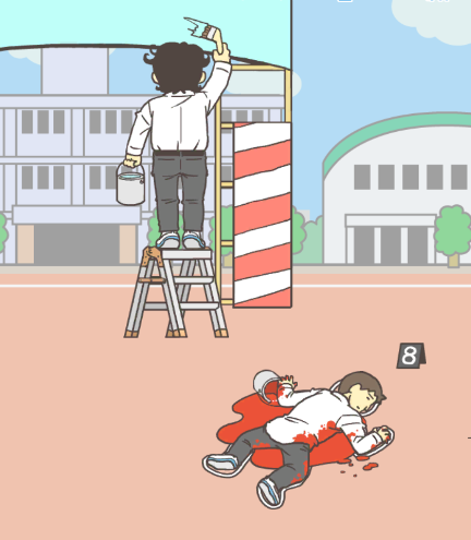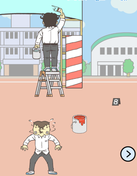 왼쪽 맵에서 빨간 페인트통을 얻어줍니다. 이번엔 페인트 칠하고 있는 학생 잘못 건드렸다가는 미션에 실패하니 주의해야합니다. 뭔가 장난치고 싶은 뒷통수지만 이악물고 지나치도록 하겠습니다. 이미 눌러서 미션 실패하고 광고본건 안비밀.