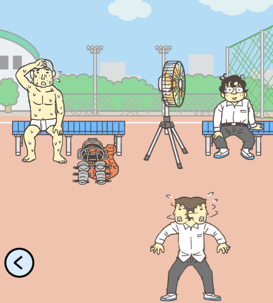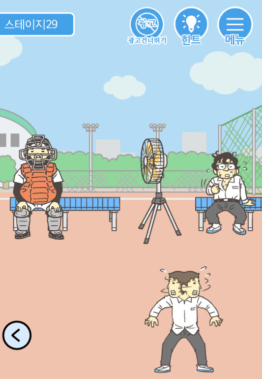 이번엔 운동장에서 야구를 하고있는 컨셉입니다. 또 선풍기가 등장했네요. 잘못 누르면 큰일 날 것 같은데 어떻게 탈출해야할까요? 일단 오른쪽 맵에 앉아있는 학생이 매우 더워보이는 모습입니다.