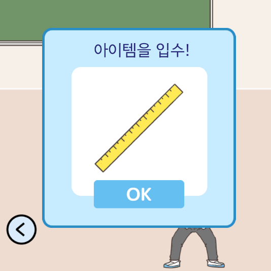 그렇다면 땡땡이에 성공하기 위해선!? 오른쪽 맵에서 자를 얻어준 뒤 오른쪽으로 가서 지우개를 자에 가져다댑니다. 그럼 분필묻은 지우개를 자로 신나게 털어대면서 먼지 사이에 가려 담임선생님 눈을 피할 수 있게됩니다. 오, 이 방법은 좀 신박했습니다.