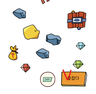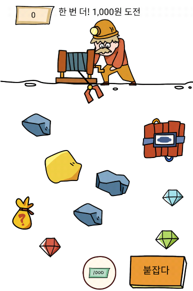 이번에는 '붙잡다'라고 쓰여진 네모 블럭을 잡아땡기면 그 뒤에 지폐가 숨어있답니다. 이것을 치운 뒤 지폐를 터치하면 미션 성공!