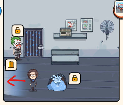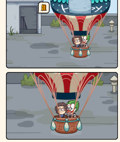 방에서 나오면 위 철창이 열려있으니 철창을 통해 밖으로 나가주세요. 다음으로 삐에로가 탄 기구를 함께 타고 기구에 달려있는 모래주머니를 터치하여 떨어트려주면 탈출에 성공!