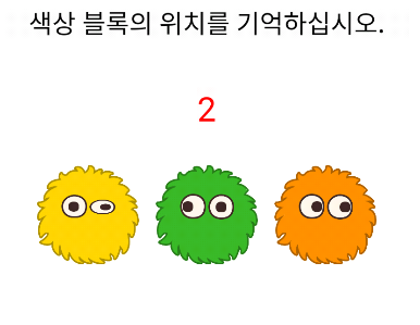 요 문제도 위에 카드 짝맞추기와 같이 주어진대로 푸는 문제랍니다. 세개의 솜뭉치 색상을 기억해주세요. 노랑-초록-주황