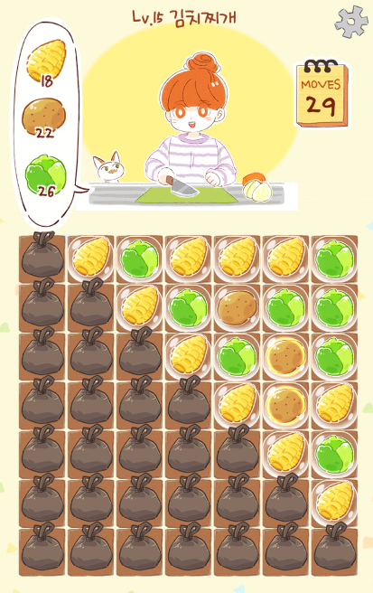 8레벨에서는 검은 봉투가 등장합니다. 주변 퍼즐을 터트리면 사라지는 장애물 입니다. 봉지를 빨리 없애줘야 퍼즐로 더 많은 재료를 없앨 수 있어요.