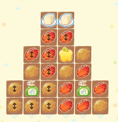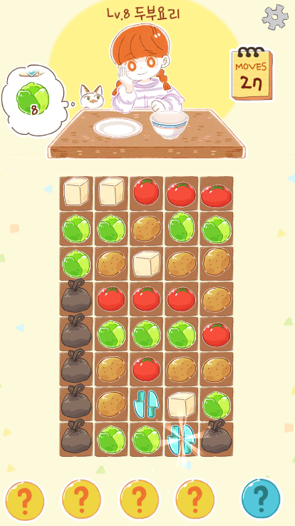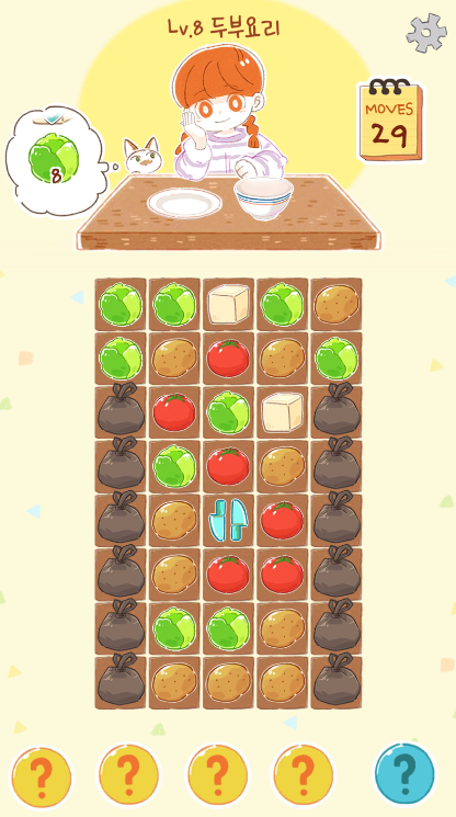 각 레벨은 음식 이름이 붙여져있으며, 해당 퍼즐 미션을 완료하면 점점 레벨이 올라가요. 퍼즐은 요리 재료로 구성되어 있으며 두부10개를 모으는 미션이니 2개 이상 연달아있는 재료를 클릭해서 얻어주면 된답니다.