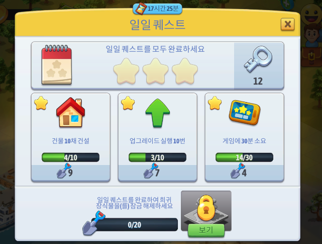 전체적인 게임을 진행하면서 수행하는 목표 달성과 함께 매일 자정에 리셋되는 일일퀘스트가 있어서 수행한 경우 추가 보상을 받을 수 있습니다.