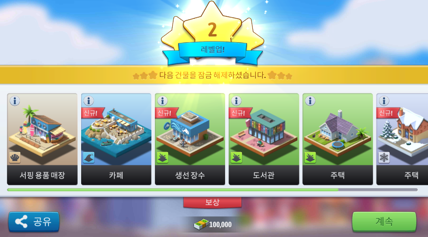건물을 추가로 설치하거나 지은 건물을 업그레이드하여 경험치를 쌓으면 레벨을 올릴 수 있습니다. 레벨이 올라가면서 고급 건축물들이 잠금해제됩니다.