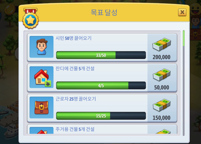 하지만 외관상 더 멋지거나 고층 건물일수록 가격 또한 급격히 높아지며 현질을 하지 않으면 골드 수급이 어렵기때문에 무과금러들이 즐기기에는 시간이 어느정도 소요될 수 있습니다. 빠르게 바로바로 성장하는 게임 스타일을 선호한다면 지루하게 느껴질 수 있으며, 조금씩 꾸준히 장기적으로 나만의 섬을 A부터 Z까지 내 취향대로 설계하고 배치하는 데서 재미를 느낀다면 성취감을 느끼며 재미있게 할 수 있을만한 게임입니다.