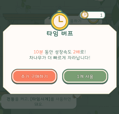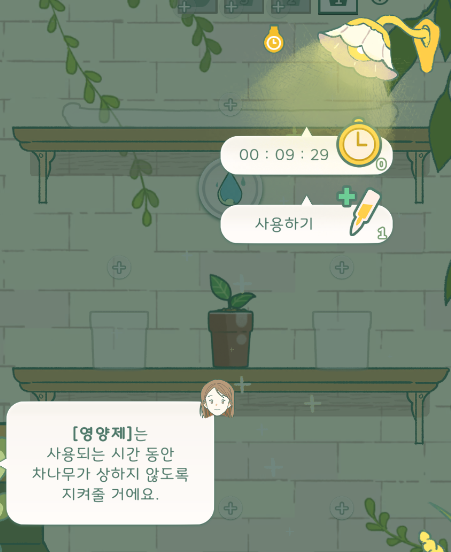 화분 위 전등을 켜면 차 재배 시간을 빠르게 하는 타임 버프와 차나무가 상하지 않도록 지켜주는 영양제를 사용할 수 있답니다.