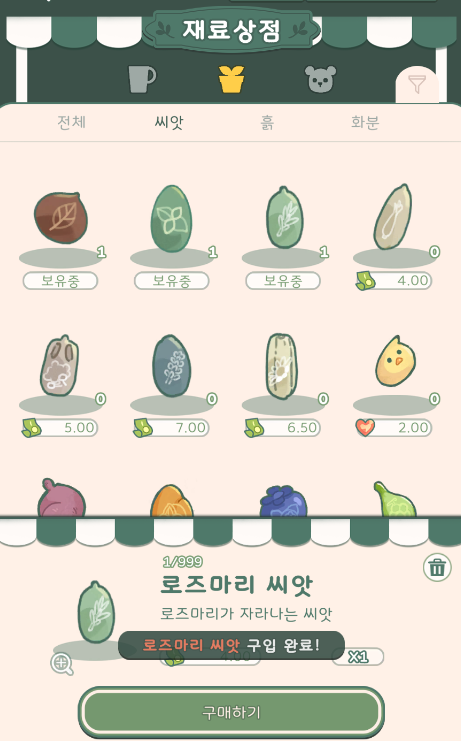 재료 상점에서 다양한 씨앗을 구매해서 키우면