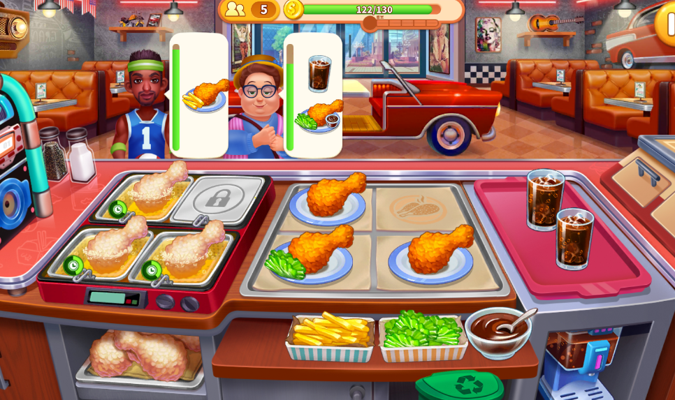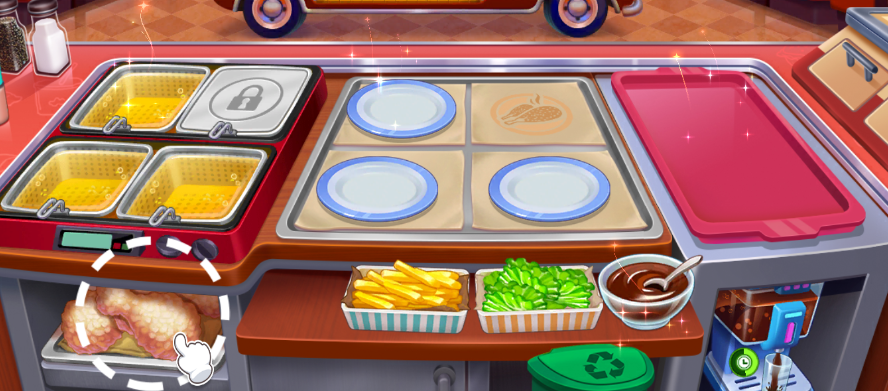 초반 메뉴로는 튀긴 닭다리와 콜라가 있습니다. 닭다리를 터치하여 기름통에 넣어준 후 초록색 게이지가 한사이클 돌면 터치하여 그릇에 담아냅니다. 손님이 주문한 메뉴에 맞게 사이드를 추가해서 제공해줍니다.