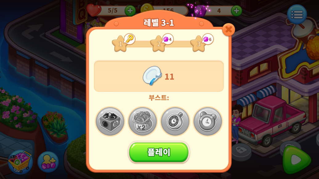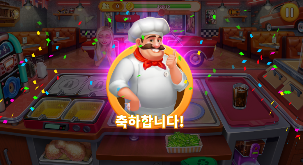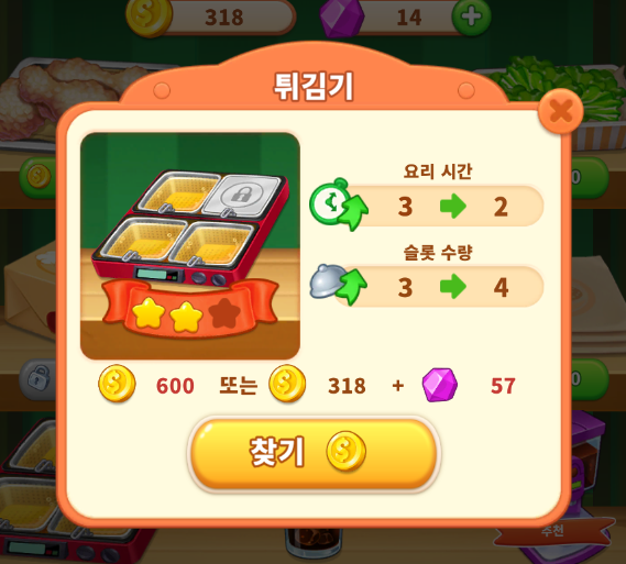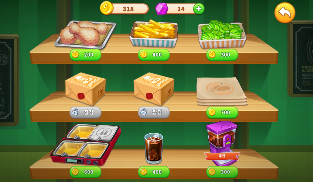 매 레벨을 달성하면서 게임 머니를 모을 수 있는데요, 모은 금액으로 레스토랑 설비를 업그레이드 할 수 있습니다.
