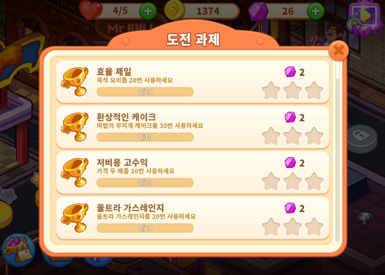 각 레벨마다 사람 표시 옆에 숫자가 있는 경우 주어진 수의 손님을 받을때까지 미션을 완료해야하며, 시계표시가 있는 경우 제한 시간 내에 미션을 완료할 수 있도록 해야합니다.
