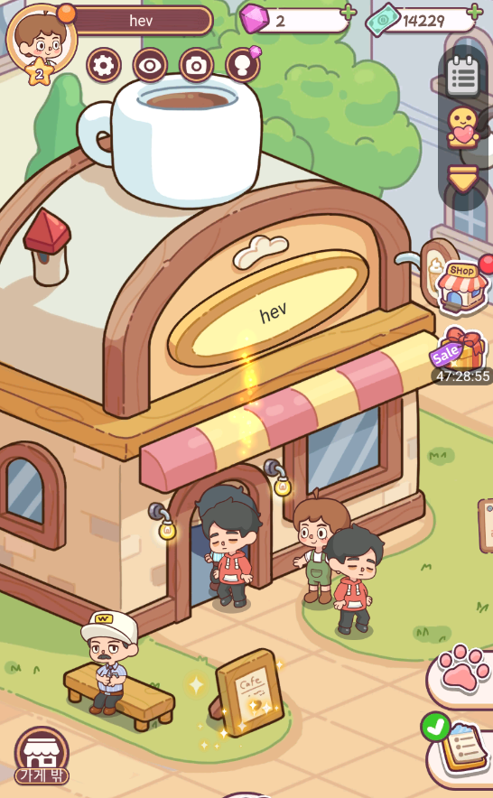 아이템을 구매하여 가게 안과 밖에 여러 편의 아이템을 설치하여 꾸며주고 운영 효율을 늘릴 수 있답니다.