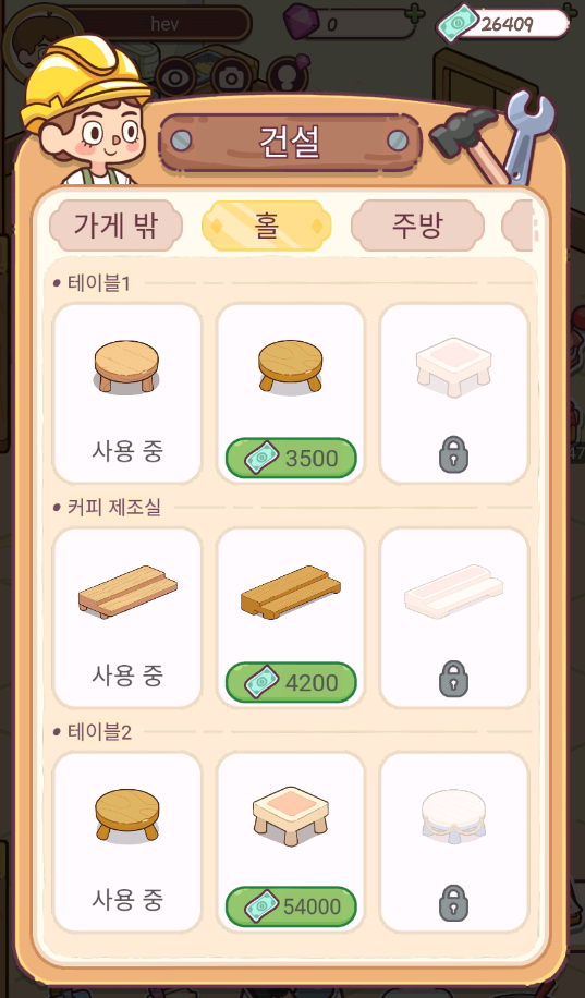 건설 메뉴에서 가게 밖, 홀, 주방, 야외, 고양이 카페 관련 아이템을 구매할 수 있습니다. 주방은 레벨4, 야외구역1은 레벨6, 야외구역2는 레벨8, 고양이 카페는 레벨10을 달성해야 잠금 해제 됩니다.