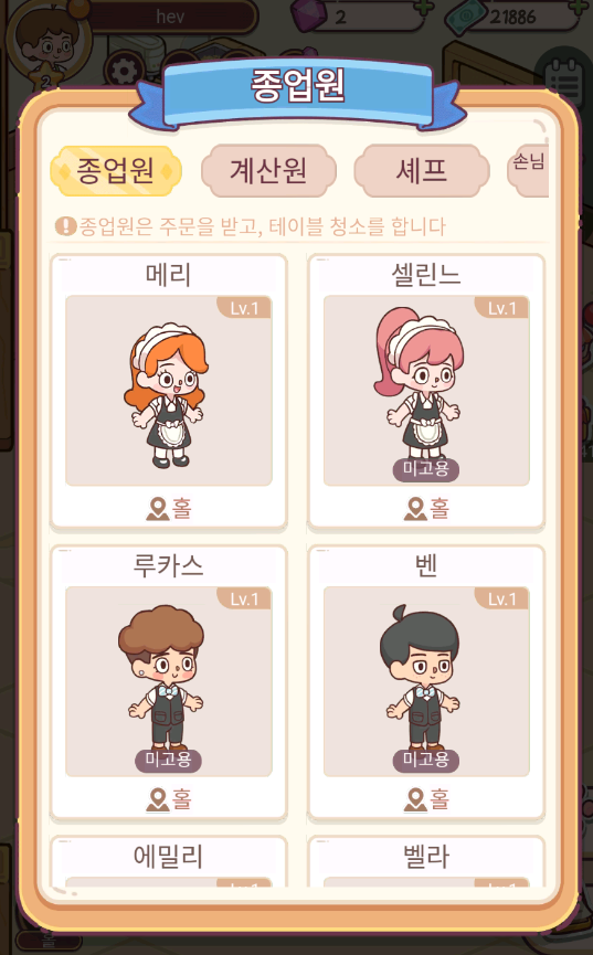 종업원 메뉴로 들어가면 가게 운영을 자동화할 수 있도록 일정 게임 머니를 지불하여 종업원을 고용할 수 있습니다. 종업원, 계산원, 셰프, 손님 맞이 종업원 이렇게 4가지 파트로 나누어져 있답니다. 홀 각 파트별로 고용하니 자동화 되어 한결 게임 운영이 편해집니다. 손님을 맞이하는 종업원의 경우 가게 밖에서 손님이 오는 속도를 높여줍니다. 또한 모든 종업원 고용시 가게 평점이 올라간답니다.