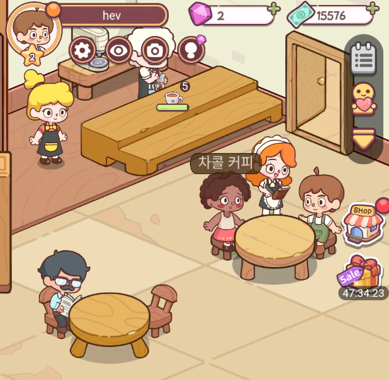 맑눈광의 기운이 느껴지는 캐릭터가 매력적이네요(?) 게임을 시작과 함께 작은 베이커리 카페를 운영하게 되는데요, 카페 내부에 홀 테이블과 주방 테이블을 하나씩 구매해주어야 운영이 가능합니다. 초기 메뉴는 차콜 커피, 블루 마운틴 코발트, 딸기 케이크, 크렘 브륄레, 롤케이크 이렇게 다섯가지에요. 카페 타이쿤 게임은 아기자기하면서 맛있어보이는 그림 퀄리티가 하나의 포인트인데 느낌을 잘 살린 듯 해요. 특히 베이커리류에 눈길이 가더라구요.