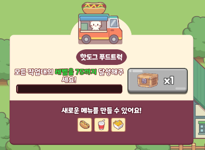 설비 업그레이드랑 가게 관리만 신경써주면 방치형이라 알아서 돈이 금방 벌리는 시스템이에요. 그래서 금새 핫도그 푸드트럭까지 업그레이드 완료! 다만, 새로운 단계에서는 가게 설비했던것과 추가 옵션 벌었던 골드까지 모두 리셋된다는 점!